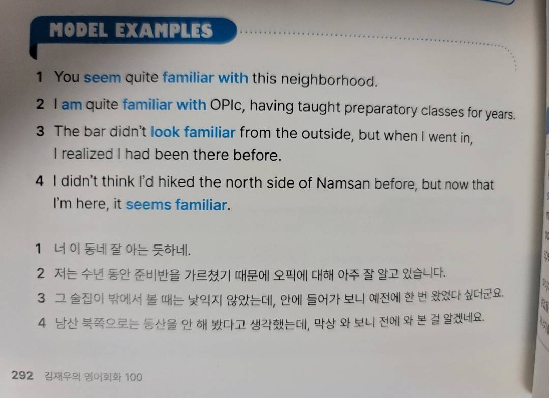 기초 회화에 필요한 단어는 과연 몇 개 일까요? 기초의 정도가 상황마다 다르겠지만 보편적으로 2000개 넉넉하게 3000개의 단어를 알면 웬만한 표현은 다 할 수 있습니다. 아래는 <김재우의 영어회화 100> Model Examples에 나오는 문장들입니다. 한글 해석을 보고 영어로 하려고 하면 생각보다 말하기가 쉽지 않지만, 영어 자체만 보면 어려운 단어 없이도 정말 필요한 표현을 다 할 수 있다는 것을 확인할 수 있습니다.